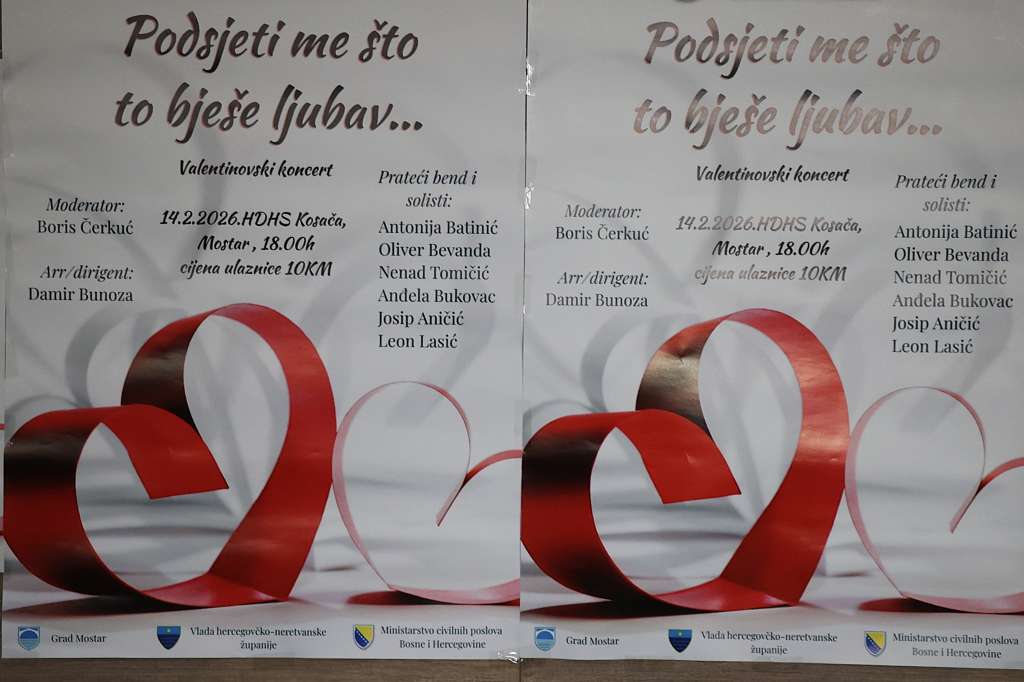 MOSTAR, 13. veljače (FENA) - Simfonijski orkestar Mostar priređuje valentinovski koncert pod nazivom "Podsjeti me što to bješe ljubav", koji će se održati u subotu, 14. veljače, u velikoj dvorani Hrvatskog doma hercega Stjepana Kosače u Mostaru s početkom u 18 sati.