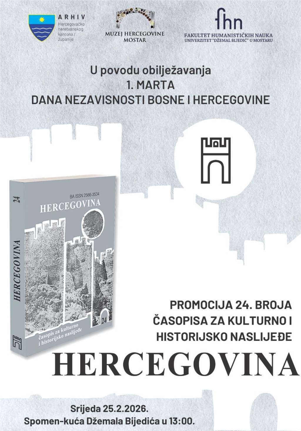 MOSTAR, 24. veljače (FENA) - Svečana promocija 24. broja časopisa za kulturno i povijesno naslijeđe "Hercegovina" održat će se u srijedu, 25. veljače, u Spomen-kući Džemala Bijedića u Mostaru, s početkom u 13 sati povodom obilježavanja Dana neovisnosti Bosne i Hercegovine.