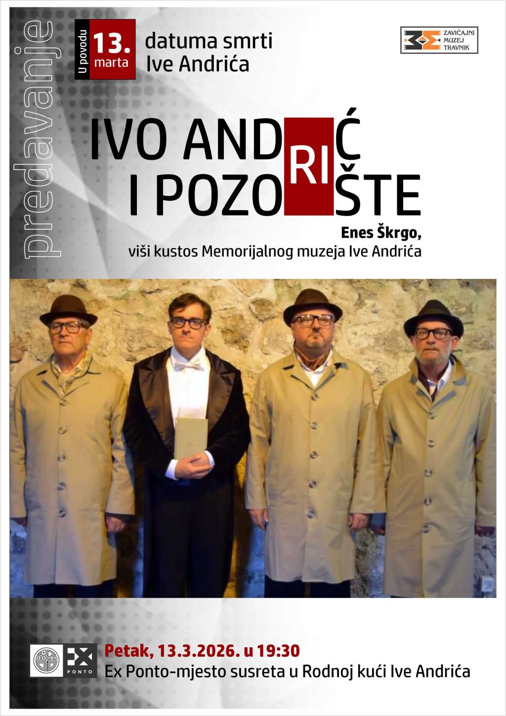TRAVNIK, 9. ožujka (FENA) - Enes Škrgo, viši kustos Memorijalnog muzeja Ive Andrića, održat će 13. ožujka s početkom u 19.30 predavanje "Ivo Andrić i pozorište" , a u povodu godišnjice smrti nobelovca Ive Andrića.