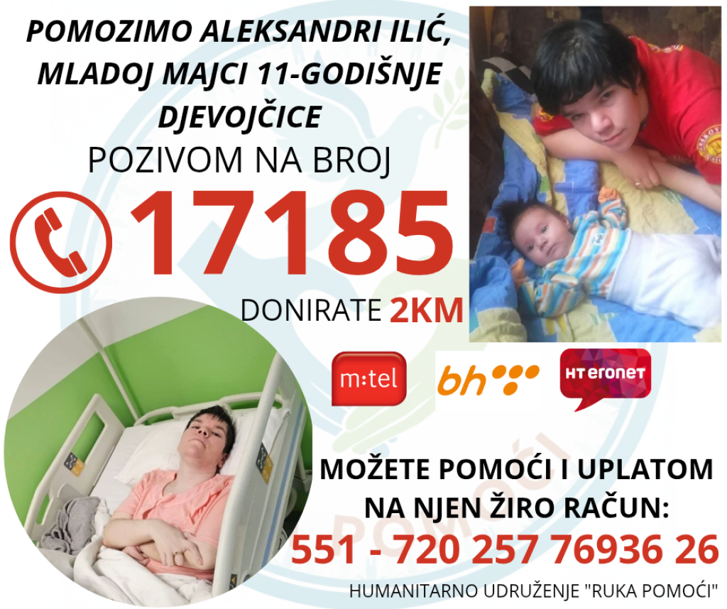 SARAJEVO, 14. marta (FENA) - Humanitarno udruženje "Ruka pomoći" pokrenulo je hitan apel za liječenje teško bolesne Aleksandre Ilić, mlade majka 11-godišnje djevojčice.