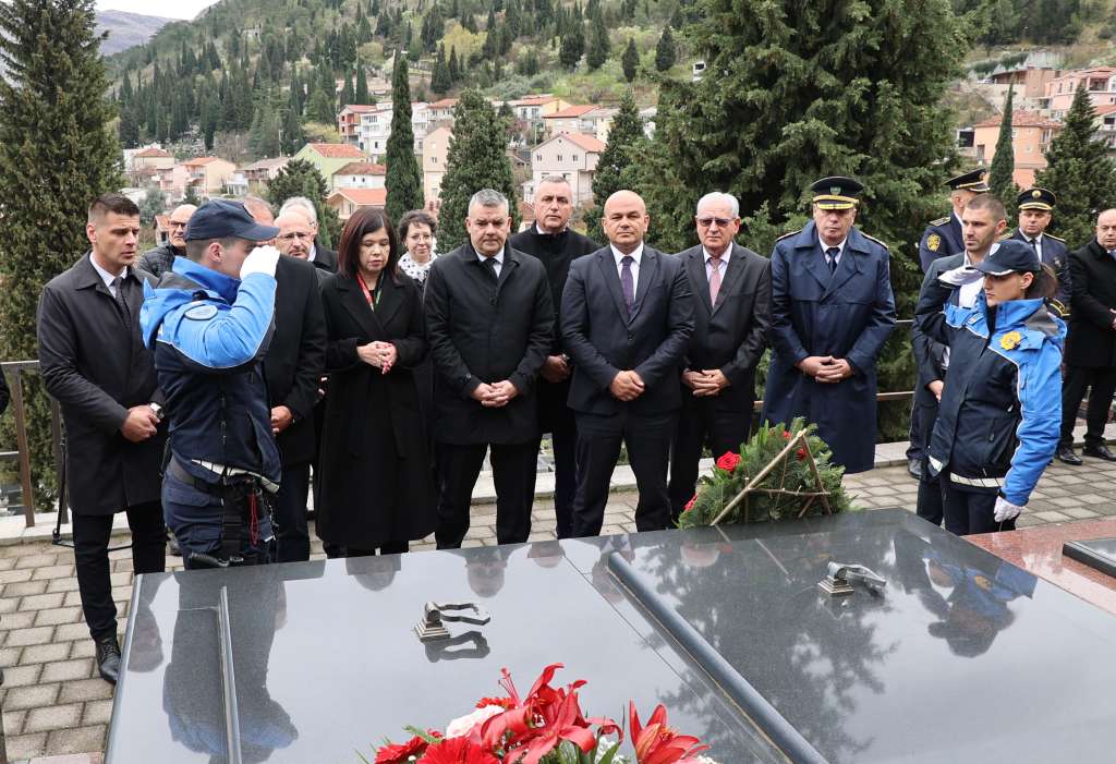 MOSTAR, 27. ožujka (FENA) - Polaganjem cvijeća i paljenjem svijeća na groblju Masline u Mostaru u petak je obilježena obljetnica smrti federalnog doministra unutarnjih poslova Joze Leutara, uz nazočnost predstavnika policijskih struktura i vlasti Hercegovačko-neretvanske županije (HNŽ).
