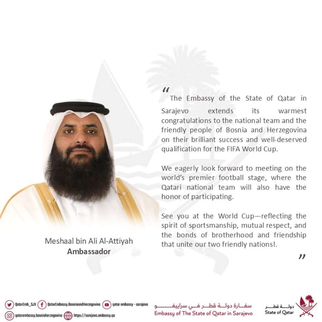 SARAJEVO, 1. aprila (FENA) - Ambasada Države Katar u Sarajevu uputila je čestitke nogometnoj reprezentaciji Bosne i Hercegovine i prijateljskom narodu BiH povodom sjajnog uspjeha i plasmana Bosne i Hercegovine na Svjetsko prvenstvo u nogometu, saopćeno je iz te ambasade.