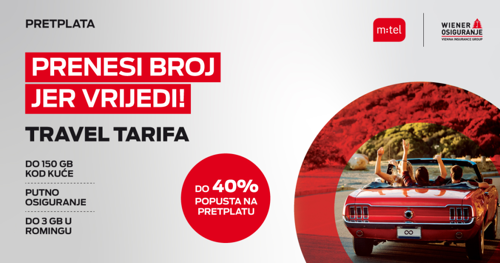 MOSTAR, 2. aprila (FENA) - Ako često putujete ili jednostavno želite više slobode u komunikaciji, sada imate dobar razlog da prenesete svoj broj u m:tel mrežu, a prenosom broja ostvarujete 40 posto popusta na mjesečnu pretplatu Travel tarife po izboru, uz sve pogodnosti koje ove savremene tarife donose, poručili su iz m:tel-a.