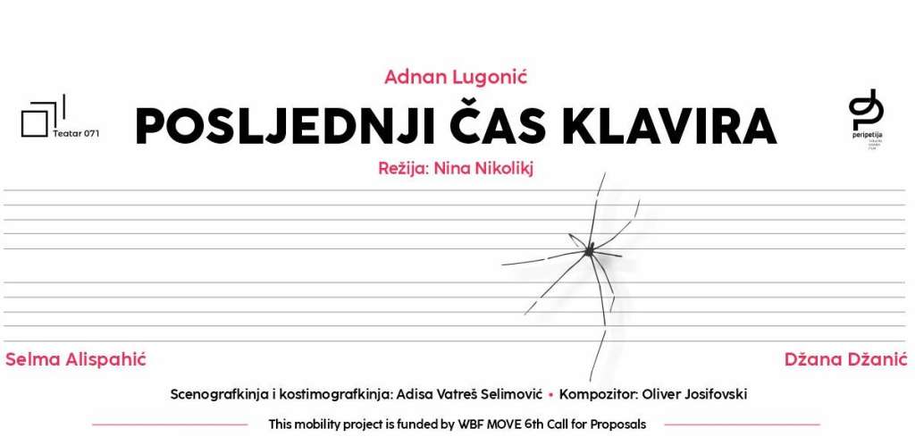 SARAJEVO, 17. aprila (FENA) - Predstava "Posljednji čas klavira" autora Adnana Lugonića i u režiji Nine Nikolić zabilježit će večeras praizvedbu na sceni novopokrenutog Teatra 071, na adresi Sime Milutinovića 2/II u Sarajevu.