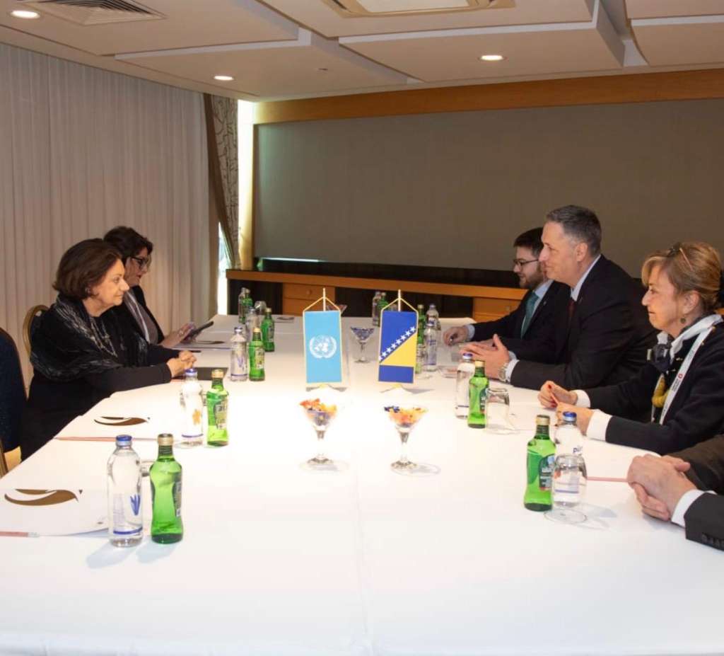 SARAJEVO, 18. aprila (FENA) - Predsjedavajući Predsjedništva Bosne i Hercegovine Denis Bećirović održao je sastanak s podsekretarkom Ujedinjenih nacija (UN) za politička pitanja i izgradnju mira Rosemary DiCarlo.
