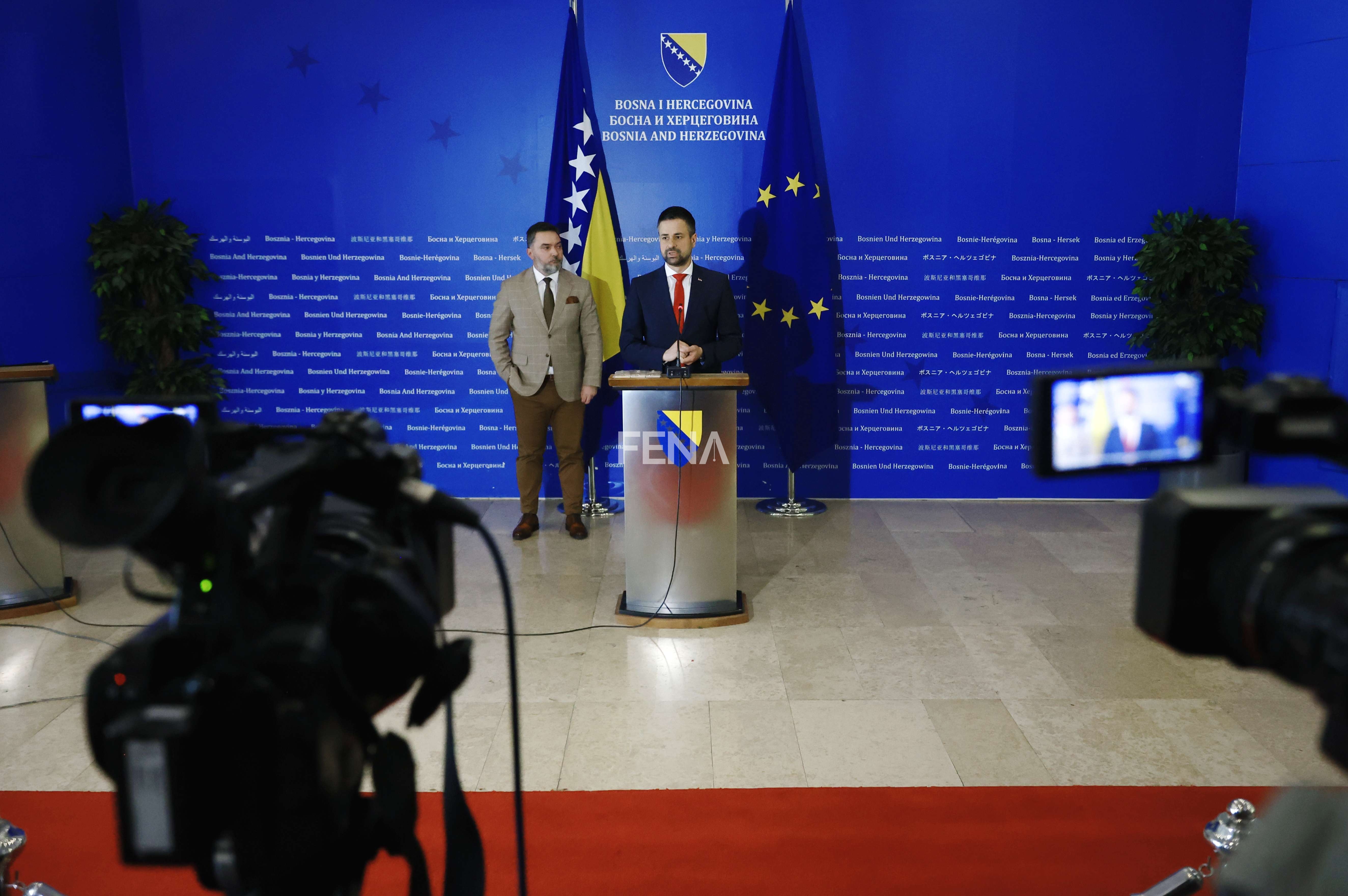 SARAJEVO, 2. juna (FENA) - Ministar vanjske trgovine i ekonomskih odnosa Bosne i Hercegovine Staša Košarac kazao je danas nakon sjednice Vijeća ministara BiH da Odluka o privremenoj suspenziji carinskih stopa kod uvoza roba iz Sjedinjenih Američkih država nije razmatrana, jer nije postignuta saglasnost na Kolegiju. (Foto FENA/Almir Razić)