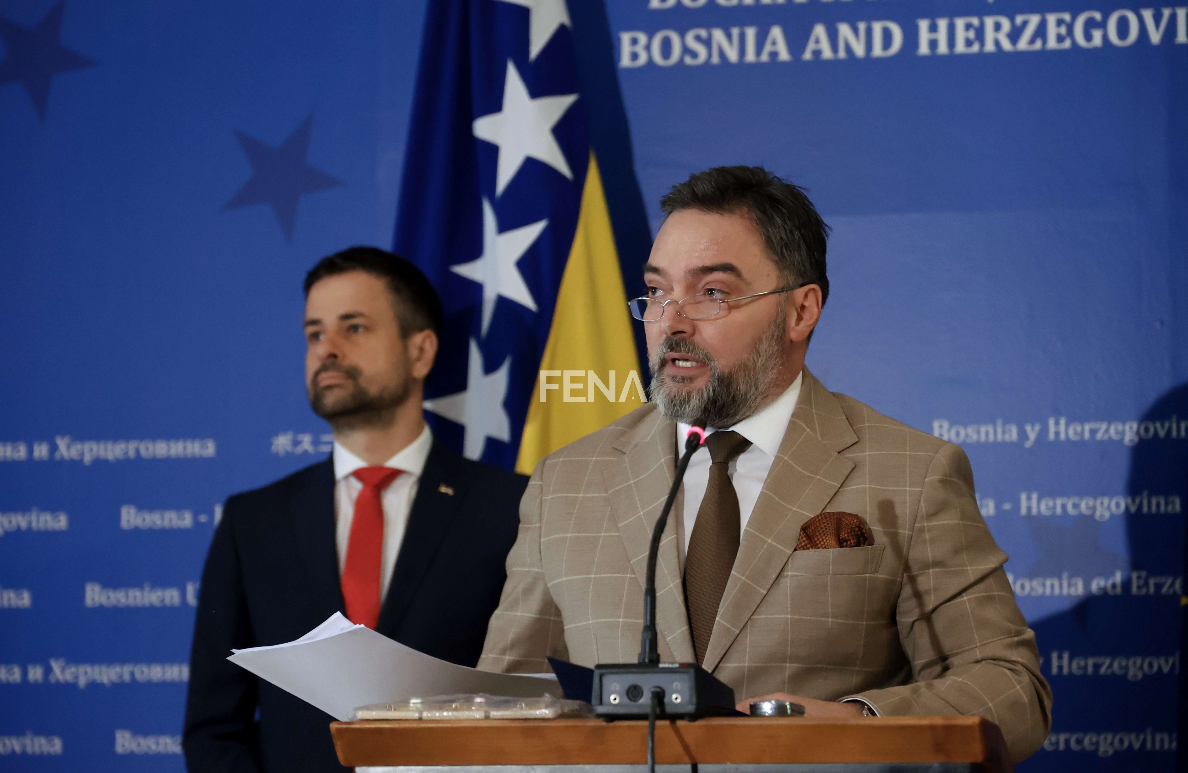 SARAJEVO, 2. juna (FENA) - Ministar vanjske trgovine i ekonomskih odnosa Bosne i Hercegovine Staša Košarac kazao je danas nakon sjednice Vijeća ministara BiH da Odluka o privremenoj suspenziji carinskih stopa kod uvoza roba iz Sjedinjenih Američkih država nije razmatrana, jer nije postignuta saglasnost na Kolegiju. (Foto FENA/Almir Razić)