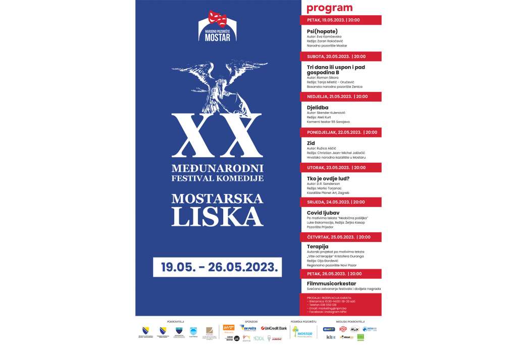 MOSTAR, 10. svibnja (FENA) - Svečano otvaranje 20. Međunarodnog festivala komedije "Mostarska liska" bit će upriličeno u petak, 19. svibnja, premijernom izvedbom predstave "Psi(hopate)" autorice Eve Kamčevske, u režiji Zorana Rakočevića, nastale u produkciji Narodnog pozorišta Mostar (NPM).