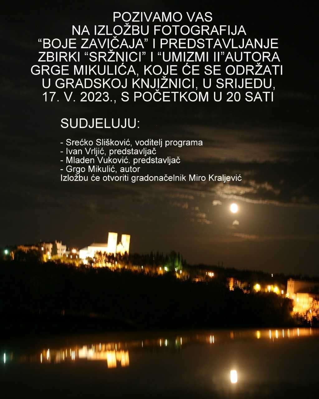 ŠIROKI BRIJEG, 15. maja (FENA) - Izložba fotografija "Boje zavičaja" i predstavljanje zbirki "Sržnici" i "Umizmi II" autora Grge Mikulića održat će se u srijedu, 17. maja u Gradskoj knjižnici u Širokom Brijegu.