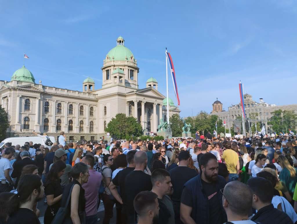 BEOGRAD, 3. lipnja (FENA) - Deseci tisuća ljudi okupili su se u subotu u Beogradu na petom prosvjedu "Srbija protiv nasilja", a namjera prosvjednika je da u povorci od Skupštine Srbije okruže četvrt u kojoj je sjedište predsjednika Republike i time naglase zahtjeve da se zaustavi promiviranje i poticanje nasilja u javnom prostoru.