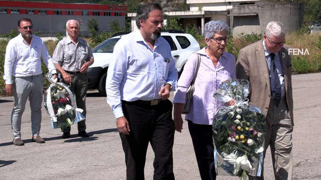 MOSTAR, 7. kolovoza (FENA) - Članovi Udruženja logoraša Mostar, predstavnici "Kruga 99“ te CSU profesor sa Državnog sveučilišta Southern Connecticut David Pettigrew ispred kapije kompleksa „Heliodrom“ u mostarskom naselju Rodoč položili su cvijeće i odali počast stradalim logorašima.