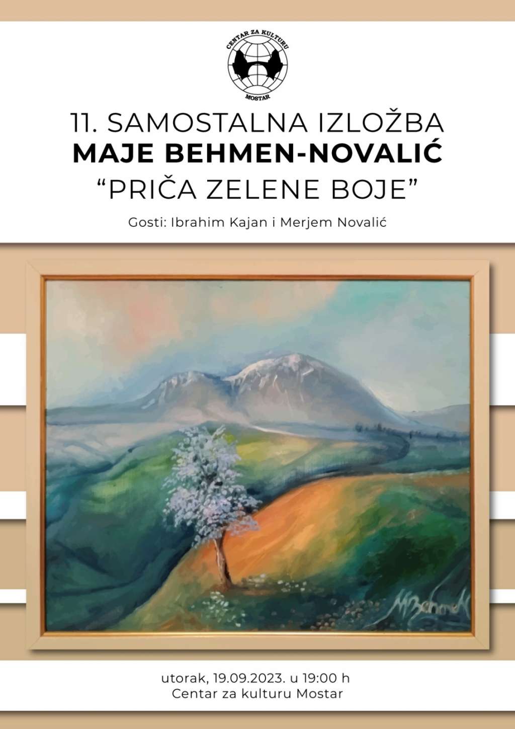 MOSTAR, 17. rujna (FENA) - Jedanaesta samostalna izložba Maje Behmen Novalić ''Priča zelene boje'' upriličit će se u utorak, 19. rujna s početkom u 19 sati u Centru za kulturu u Mostaru.