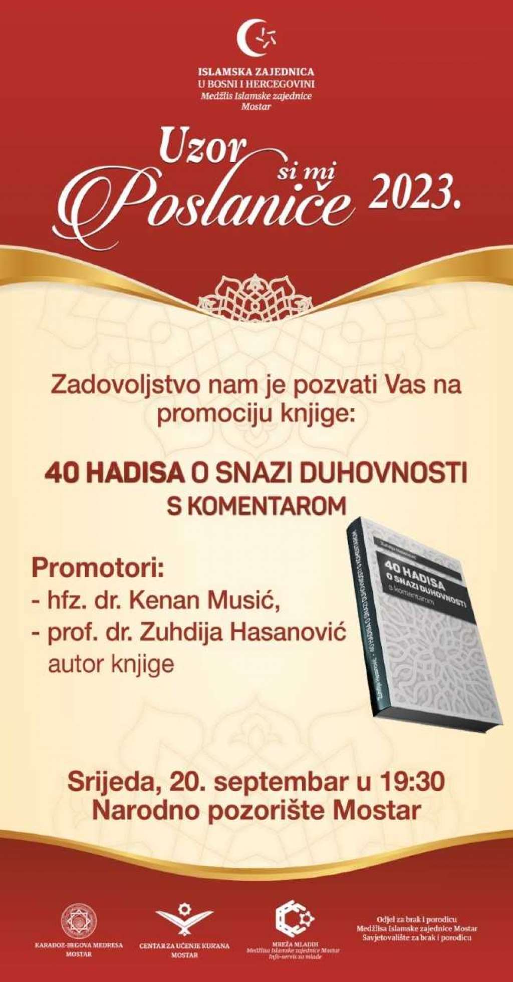 MOSTAR, 19. septembra (FENA) - U okviru manifestacije "Uzor si mi, Poslaniče'' u organizaciji Medžlisa IZ-a Mostar u srijedu, 20. septembra, u Narodnom pozorištu Mostar bit održana promocija knjige "40 hadisa o snazi duhovnosti s komentarom'', prof. dr. Zuhdije Hasanovića.