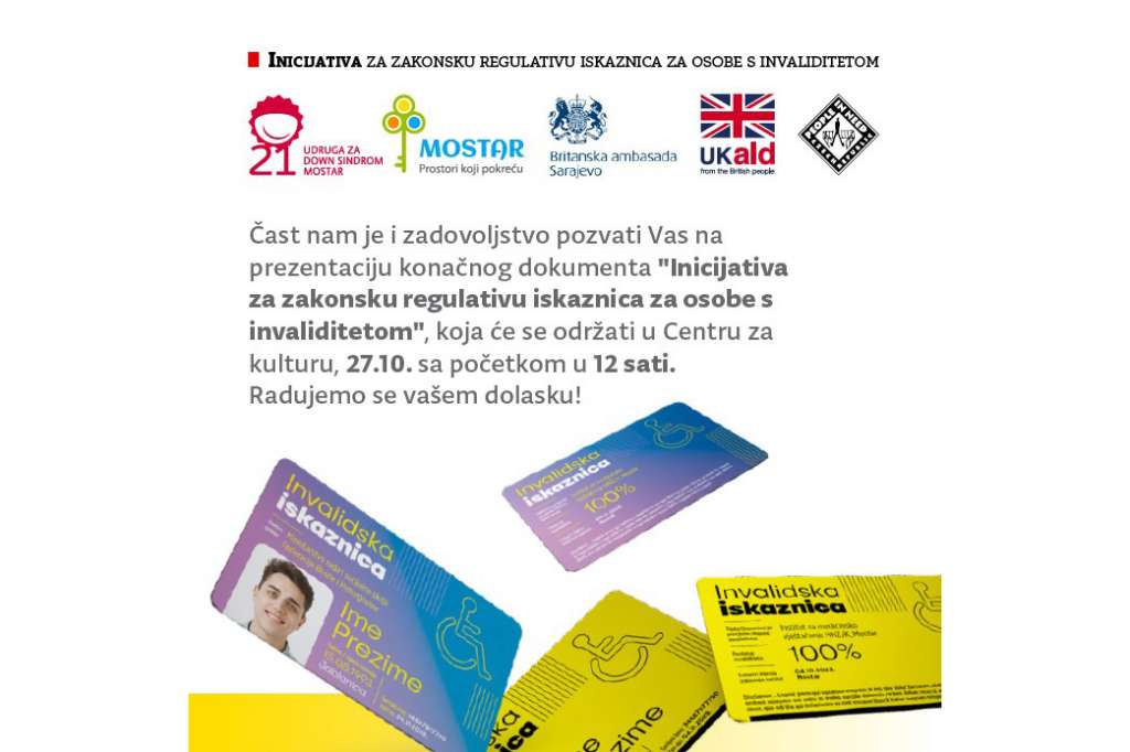 MOSTAR, 25. listopada (FENA) - Prezentacija konačnog dokumenta "Inicijativa za zakonsku regulativu iskaznica za osobe s invaliditetom" održat će se u Centru za kulturu Mostar s početkom u 12 sati.