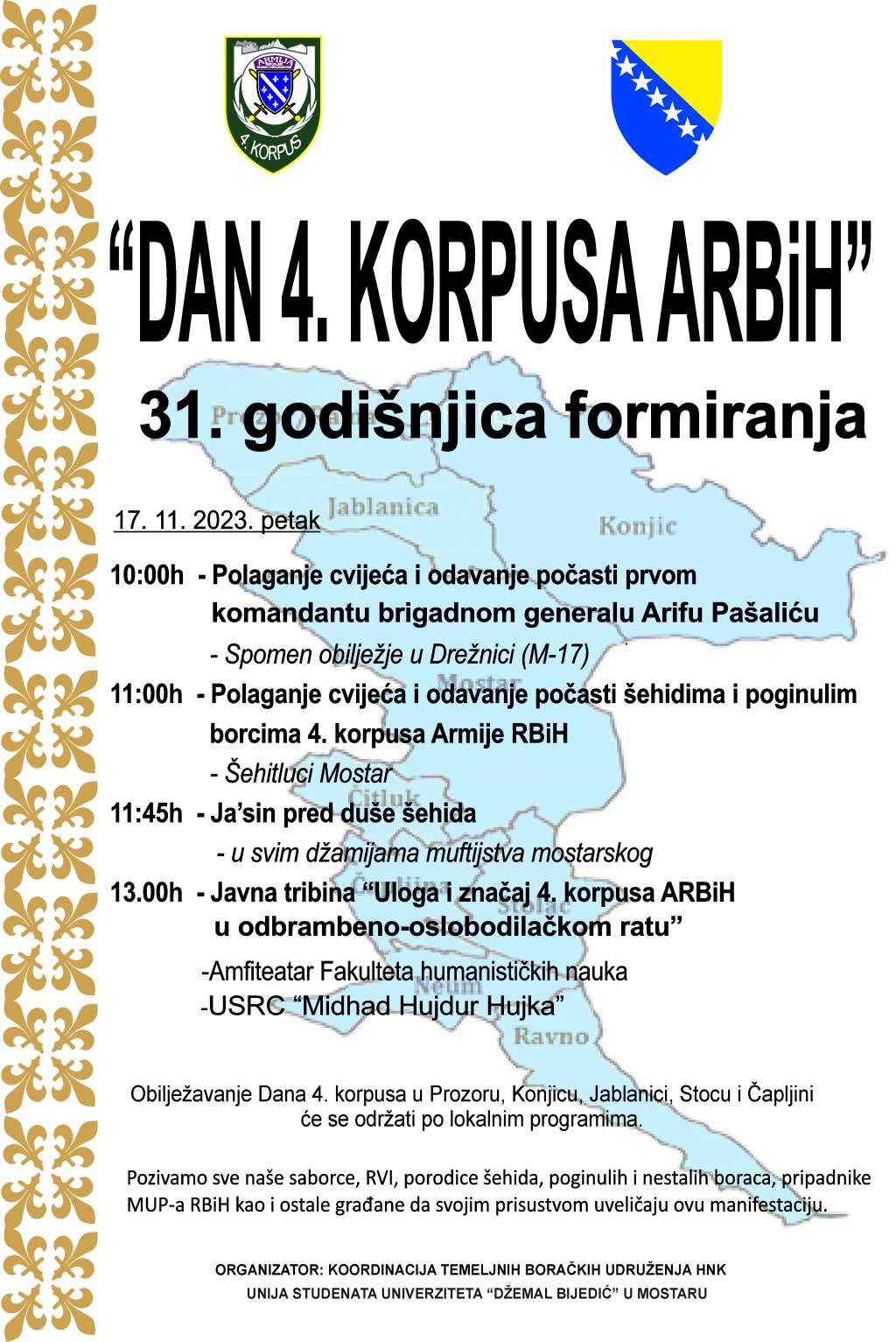MOSTAR, 14. novembra (FENA) - Obilježavanje 31. godišnjice formiranja 4. korpusa Armije RBiH bit će upriličeno u petak, 17. novembra, a počet će u 10 sati polaganjem cvijeća i odavanjem počasti prvom komandantu brigadnom generalu Arifu Pašaliću kod spomen obilježja u Drežnici.
