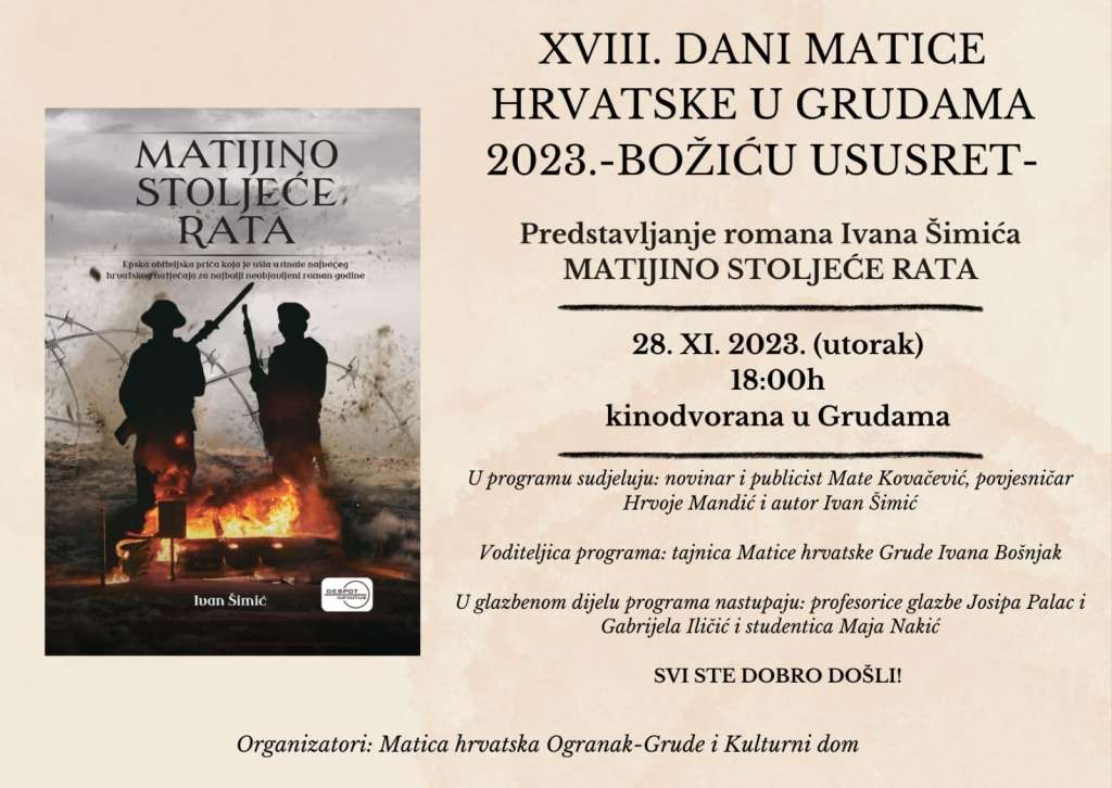 GRUDE, 28. studenoga (FENA) – U sklopu XVIII. Dana Matice hrvatske u Grudama 2023. - Božiću ususret, upriličit će se predstavljanje romana ''Matijino stoljeće rata'', autora Ivana Šimića večeras u 18 sati u kinodvorani u Grudama.