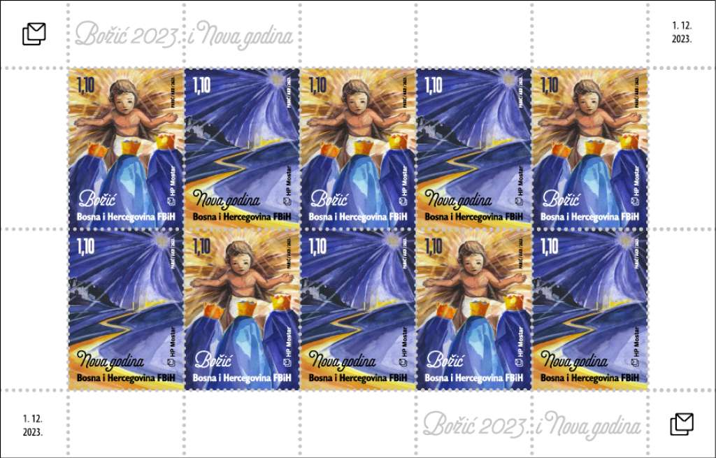 MOSTAR, 1. prosinca (FENA) - Hrvatska pošta (HP) Mostar prigodnim poštanskim markama tradicionalno obilježava Božić i Novu godinu. Marke su tiskane u arku 10 te kao samoljepive u rolama pakiranim u prigodne kutije od po 100 komada (50 s božićnim i 50 s novogodišnjim motivom). U poštanskom prometu koriste od 1. prosinca 2023.