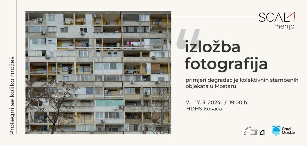 MOSTAR, 4. ožujka (FENA) - Izložba fotografija „Protegni se koliko možeš - Primjeri degradacije stambenih objekata u Mostaru“, bit će otvorena u četvrtak 7. ožujka, u 19 sati u Galeriji kraljice Katarine Kosače.