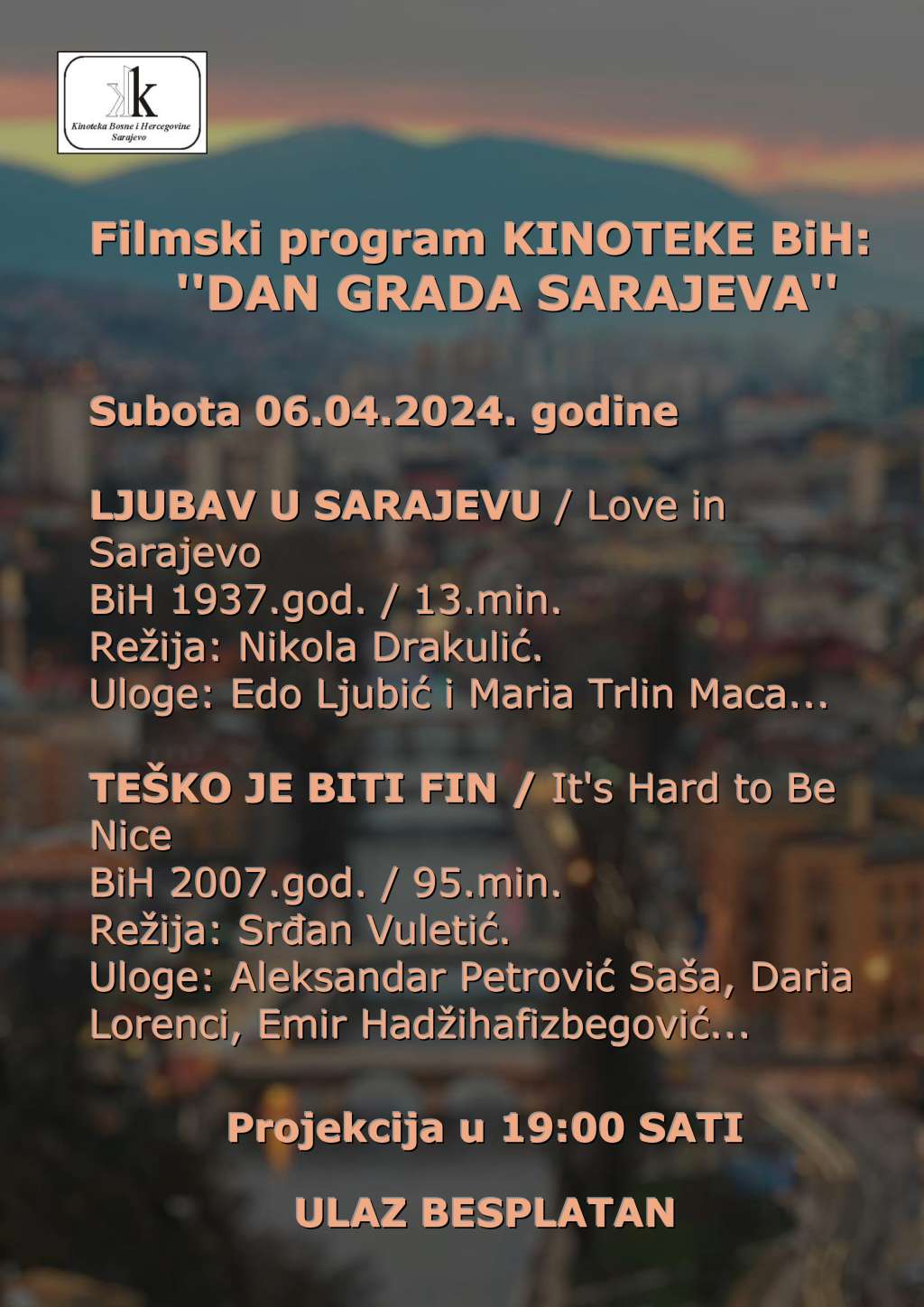 SARAJEVO,3.aprila (FENA) – Kinoteka Bosne i Hercegovine će za Dan grada Sarajeva prirediti projekciju dva filma, uz besplatan ulaz za građane.