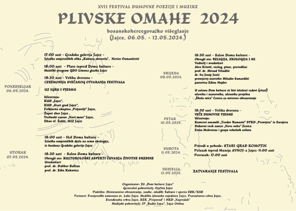JAJCE, 26. travnja (FENA) - Festival duhovne poezije i muzike "Plivske omahe" i ove će godine svim svojim posjetiteljima ponuditi bogat i raznolik program, a održat će se od 6. do 12. svibnja u Jajcu.