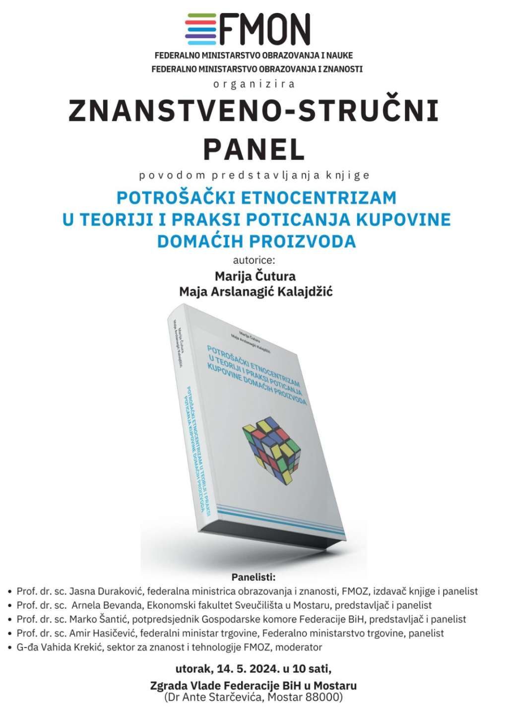 MOSTAR, 14. svibnja (FENA) - Znanstveno-stručni panel povodom predstavljanja knjige "Potrošački etnocentrizam u teoriji i praksi poticanja kupovine domaćih proizvoda", autorica Marije Čutura, redovite profesorice na Ekonomskom fakultetu Sveučilišta u Mostaru i Maje Arslanagić Kalajdžić, redovite profesorice na Ekonomskom fakultetu Univerziteta u Sarajevu održat će se danas u Mostaru.