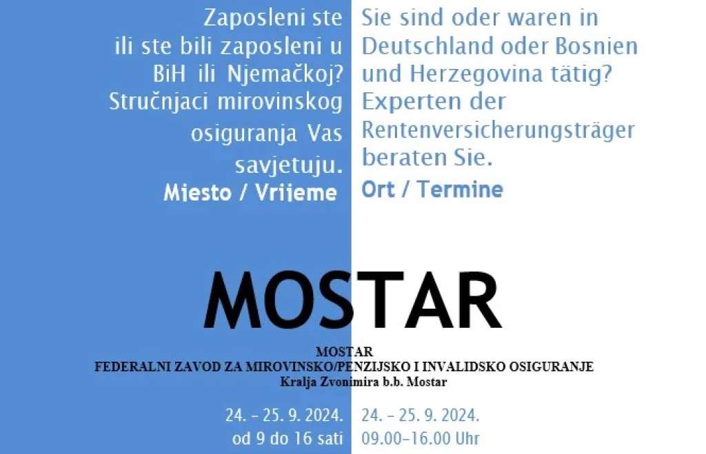 MOSTAR, 28. kolovoza (FENA) - Federalni zavod za mirovinsko i invalidsko osiguranje (FZ MIO-PIO) u suradnji s nositeljem mirovinskog osiguranja iz Savezne Republike Njemačke (Deutsche Renteversicherung) organizira Međunarodne savjetodavne dane za osiguranike koji su zaposleni ili bili zaposleni u SR Njemačkoj, a koji će se održati 24. i 25. rujna u prostorijama Zavoda u Mostaru od 9 do 16 sati.