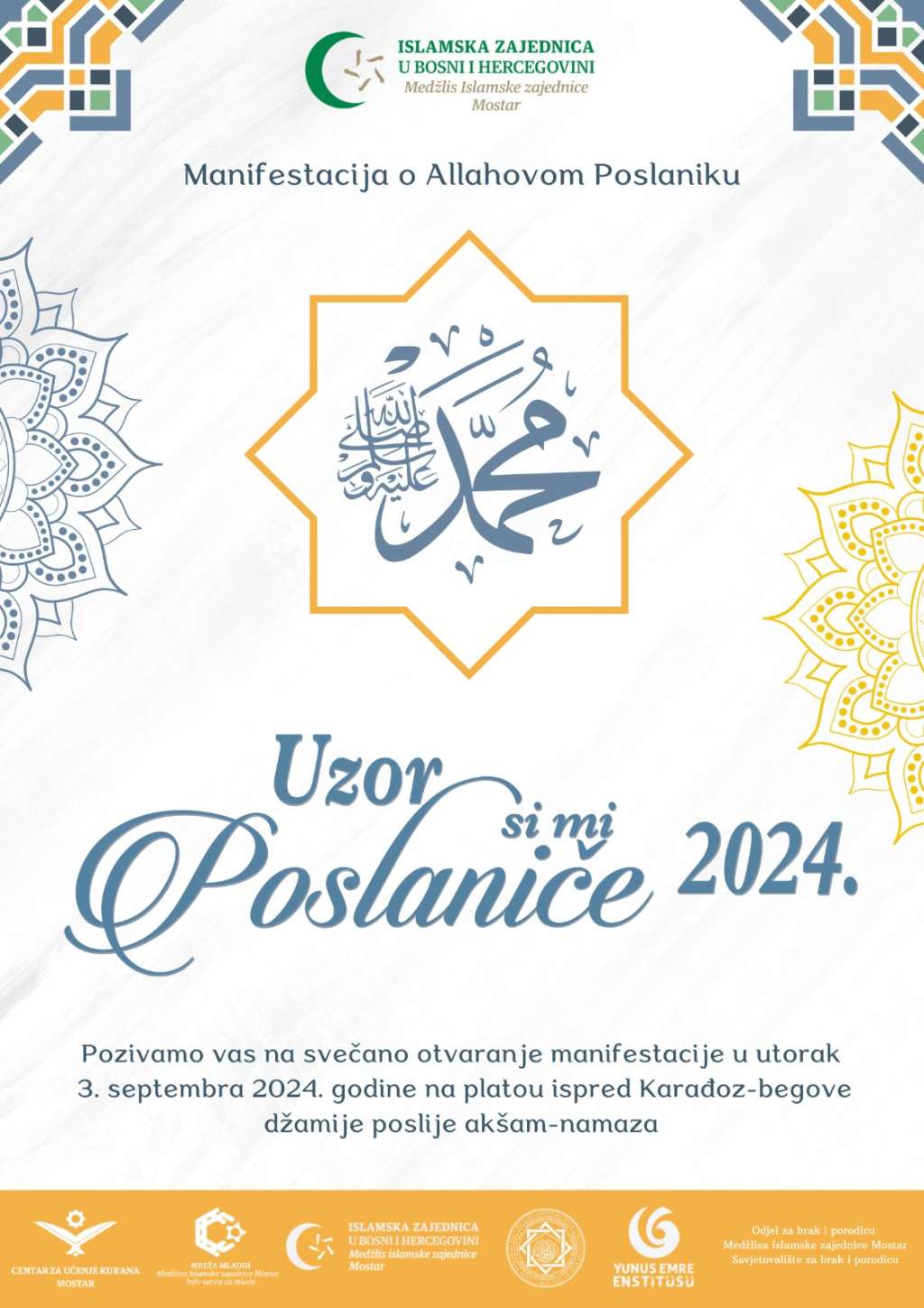 MOSTAR, 2. septembra (FENA) - U povodu obilježavanja mjeseca rođenja posljednjeg Božjeg Poslanika Muhameda a.s. Medžlis Islamske zajednice Mostar, u saradnji s Karađoz–begovom medresom, Institutom Yunus Emre, Info–servisom za mlade (Mrežom mladih Medžlisa), Centrom za učenje Kur'ana Mostar i Odjelom za brak i porodicu, od 3. septembra do 3. oktobra organizira niz prigodnih vjerskih i kulturnih događaja.