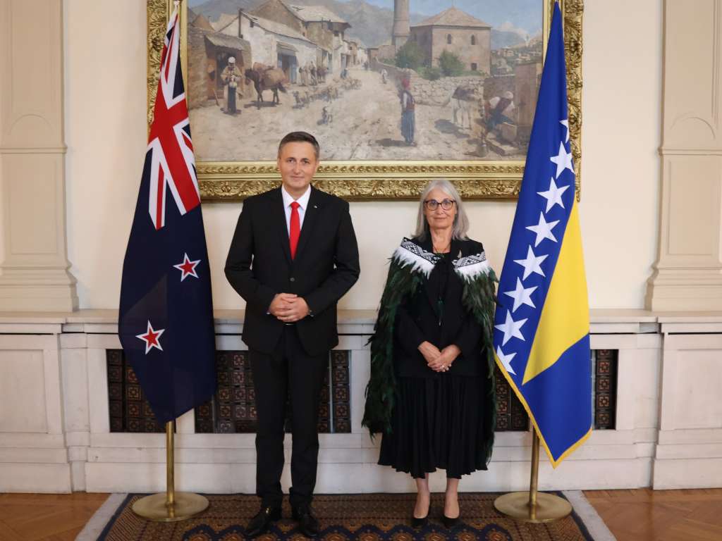 SARAJEVO, 9. septembra (FENA) - Predsjedavajući Predsjedništva BiH Denis Bećirović primio je akreditivno pismo novoimenovane ambasadorice Novog Zelanda za Bosnu i Hercegovinu sa sjedištem u Rimu Jacqueline Anne Frizelle. Konstantovao je da su bilateralni odnosi Bosne i Hercegovine i Novog Zelanda dobri i prijateljski.