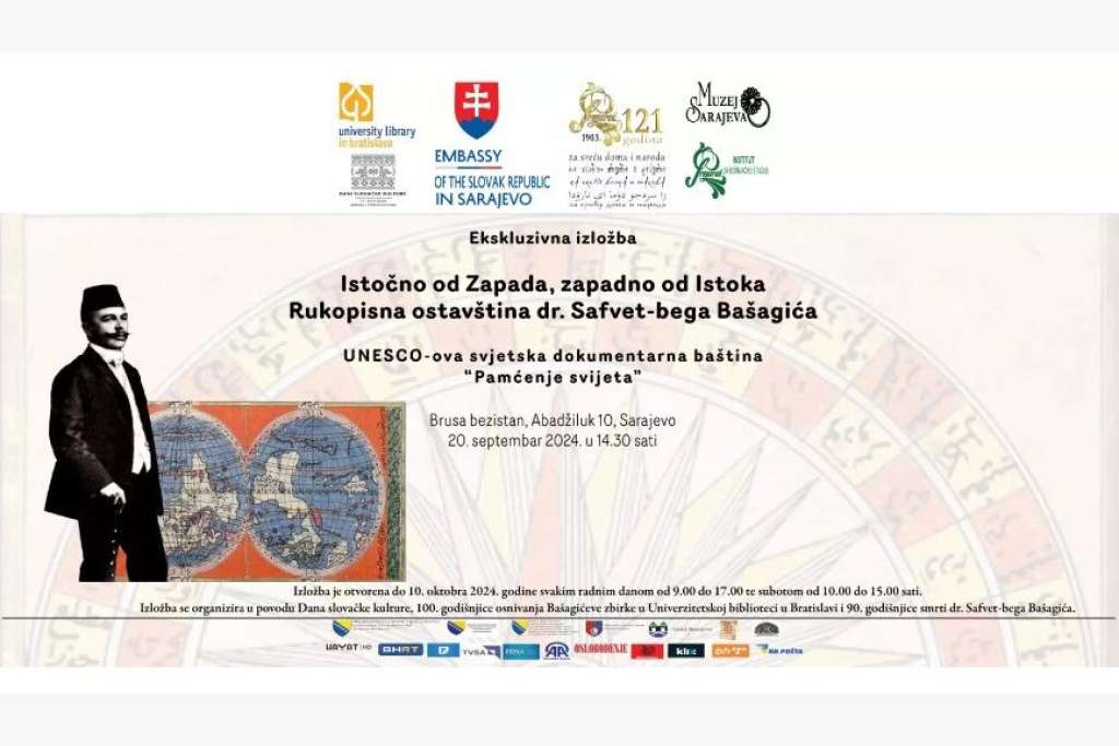 SARAJEVO, 16. septembra (FENA) - Ambasada Slovačke Republike u Bosni i Hercegovini i Bošnjačka zajednica kulture "Preporod" u saradnji s Univerzitetskom bibliotekom u Bratislavi i Muzejom Sarajeva organiziraju ekskluzivnu izložbu Istočno od Zapada, zapadno od Istoka: Rukopisna ostavština dr. Safvet-bega Bašagića (UNESCO-ova svjetska dokumentarna baština „Pamćenje svijeta“).