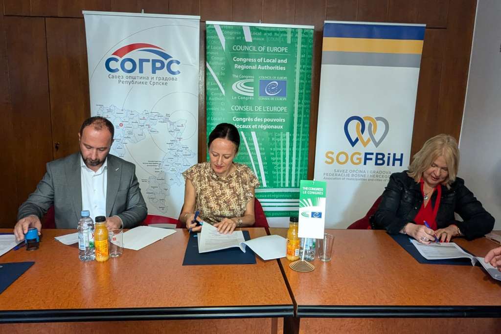 SARAJEVO, 10. oktobra (FENA) - Šefica Ureda Vijeća Evrope u Sarajevu Bojana Urumova potpisala je danas sa čelnicima saveza općina i gradova Federacije Bosne i Hercegovine i Republike Srpske, Vesnom Travljanin i Branislavom Samardžićem, ugovore o grantovima za podršku uspostavi i razvoju novih struktura i institucionalnog okvira za tješnju saradnju i razmjenu informacija.