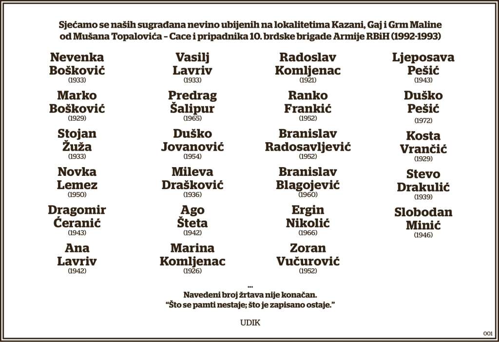SARAJEVO, 25. oktobra (FENA) - Udruženje za društvena istraživanja i komunikacije (UDIK) podsjeća javnost na trideset i prvu godišnjicu zločina na Kazanima počinjenim nad većinom nebošnjacima Sarajeva tokom 1992. i 1993. godine.