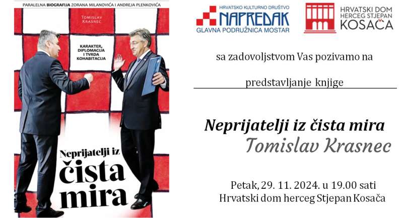 SARAJEVO, 27. studenoga (FENA) – Hrvatsko kulturno društvo Napredak organiziralo je u Sarajevu promociju knjige "Neprijatelji iz čista mira", autora Tomislava Krasneca. Ovu usporednu biografiju dvojice danas najutjecajnijih hrvatskih političara - Zorana Milanovića i Andreja Plenkovića u Napretkovom klubu „Lira“ promovirali su glavni urednik Večernjeg lista Dražen Klarić, poznati bosanskohercegovački novinar Ranko Mavrak te autor Tomislav Krasnec.