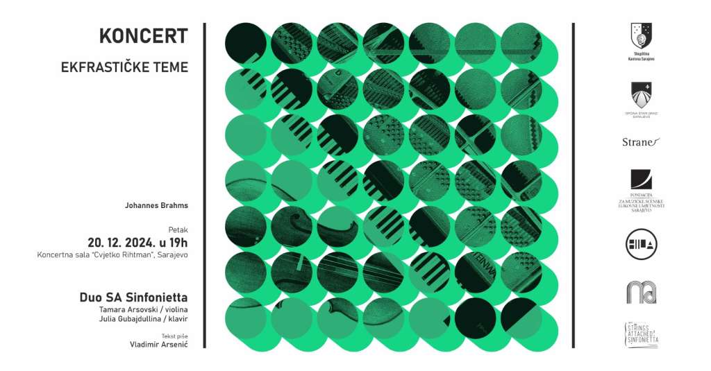 SARAJEVO, 17. decembra (FENA) - Udruženje za razvoj muzičke umjetnosti i pedagogije "Strings Attached Sinfonietta" najavljuje drugi koncert u okviru projekta Ekfrastičke teme, koji ove godine nastavlja afirmaciju umjetničke muzike kroz povezivanje različitih umjetničkih formi. Projekat, koji se organizira drugu godinu zaredom, ima za cilj da muzičkom stvaralaštvu pridoda nove dimenzije kroz sinergiju muzike i književnog izraza - navode iz tog udruženja.