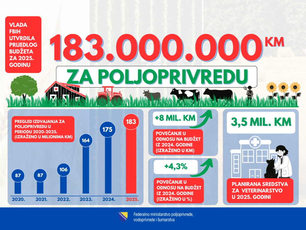 SARAJEVO, January 21 (FENA) - The FBiH Ministry of Agriculture, Water Management, and Forestry announced that the allocations for agriculture in the proposed Federation of Bosnia and Herzegovina budget for 2025, which the FBiH Government determined at yesterday's session, are planned at 183 million KM, with an additional 3.5 million KM allocated for veterinary services.