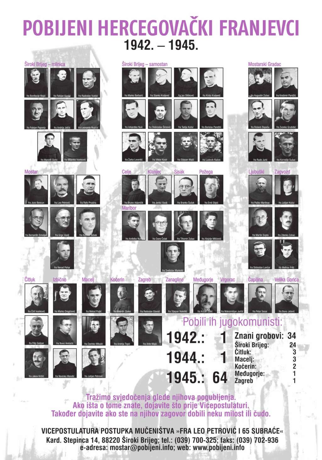 ŠIROKI BRIJEG, 29. siječnja (FENA) - "Dani pobijenih hercegovačkih franjevaca" u povodu 80. obljetnice jugokomunističkog ubojstva 66 hercegovačkih franjevaca u Drugom svjetskom ratu i poraću održat će se u Širokom Brijegu od 31. siječnja do 7. veljače u organizaciji Vicepostulature postupka mučeništva "Fra Leo Petrović i 65 subraće" na čelu s vicepostulatorom fra Miljenkom Stojićem.