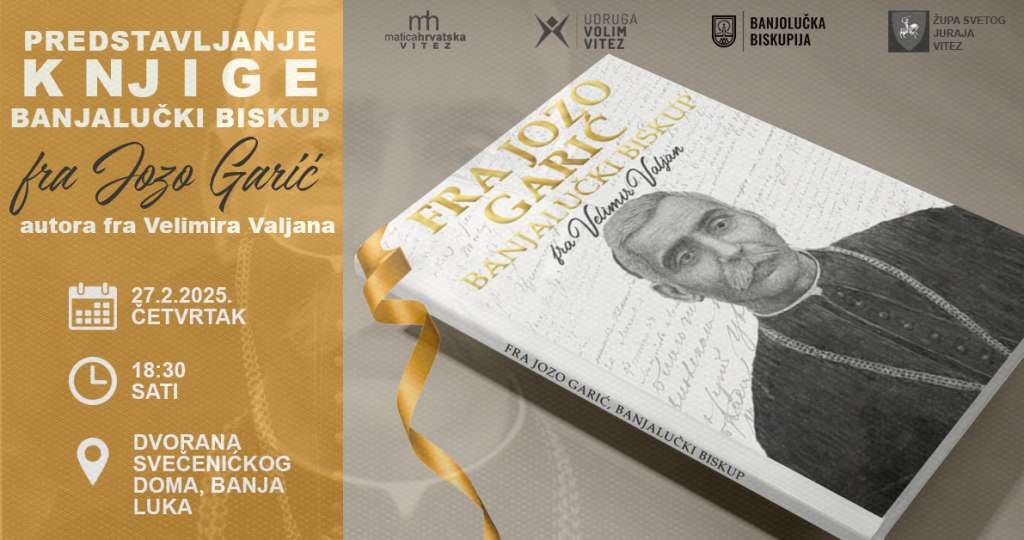 BANJA LUKA, 19. veljače (FENA) – Predstavljanje knjige "Fra Jozo Garić – banjalučki biskup", autora fra Velimira Valjana održat će se 27.veljače, s početkom u 18.30 sati, u Dvorani svećeničkog doma u Banjoj Luci.