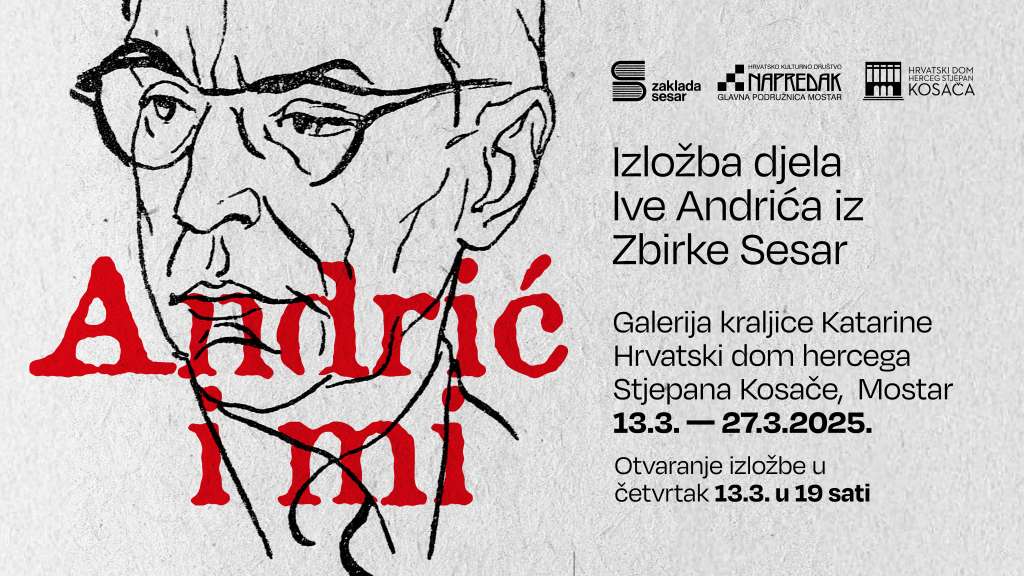 MOSTAR, 7. ožujka (FENA) - U povodu pedesete obljetnice smrti književnika Ive Andrića, HKD Napredak Glavna podružnica Mostar, Hrvatski dom hercega Stjepana Kosače i Zaklada Sesar organiziraju izložbu djela Ive Andrića iz Zbirke Sesar.