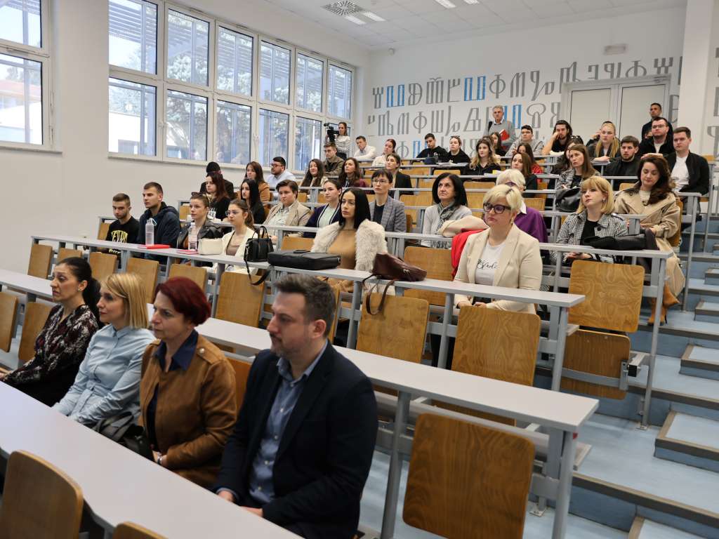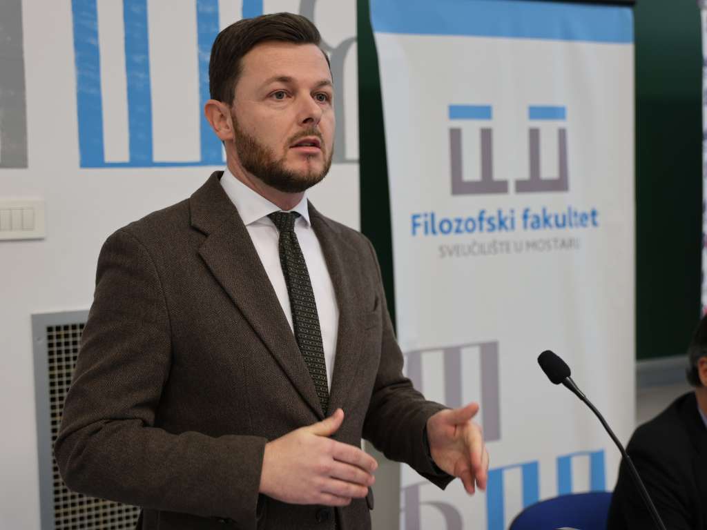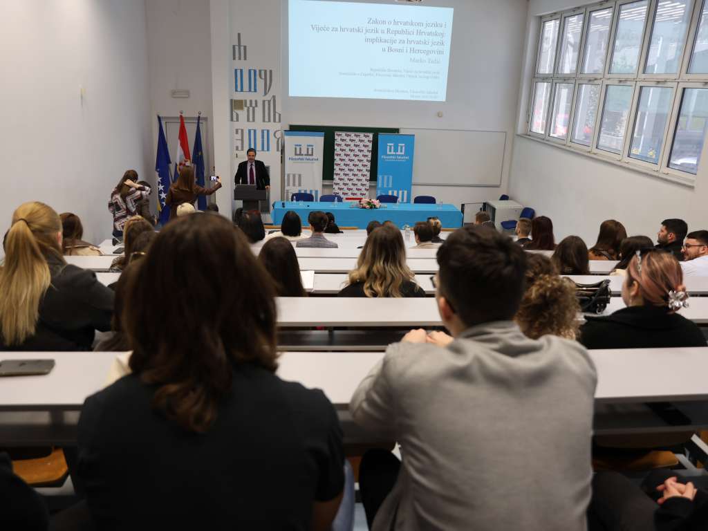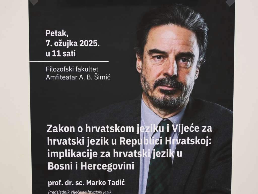 MOSTAR, 7. ožujka (FENA) – Predsjednik Vijeća za hrvatski jezik prof. dr. sc. Marko Tadić održao je u petak na Filozofskom fakultetu Sveučilišta u Mostaru (SUM) predavanje na temu "Zakon o hrvatskom jeziku i Vijeće za hrvatski jezik u Republici Hrvatskoj: implikacije za hrvatski jezik u Bosni i Hercegovini".