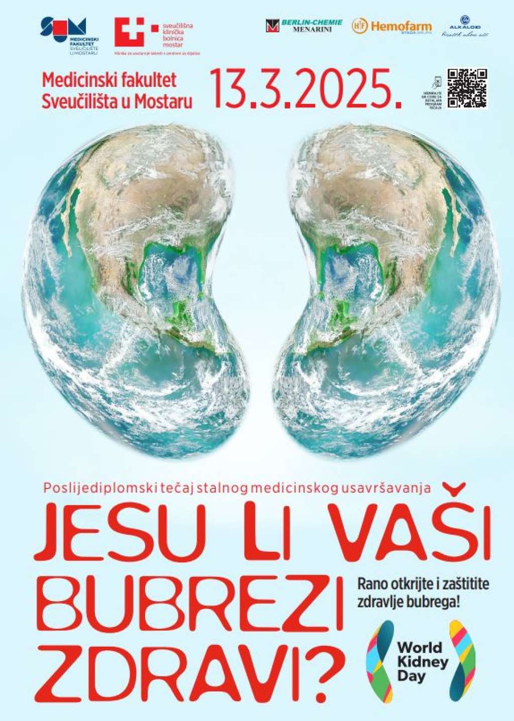 MOSTAR, 10. ožujka (FENA) - Medicinski fakultet Sveučilišta u Mostaru i SKB Mostar - Klinika za unutarnje bolesti s centrom za dijalizu organiziraju simpozij poslijediplomskog medicinskog usavršavanja pod nazivom "Jesu li vaši bubrezi zdravi? Rano otkrijte, zaštitite zdravlje bubrega".