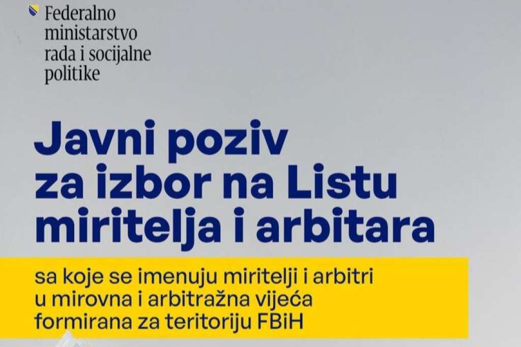 SARAJEVO, 12. marta (FENA) - Federalno ministarstvo rada i socijalne politike objavilo je Javni poziv za izbor kandidata na Listu miritelja i arbitara, s koje se imenuju članovi mirovnih i arbitražnih vijeća za teritoriju Federacije Bosne i Hercegovine.