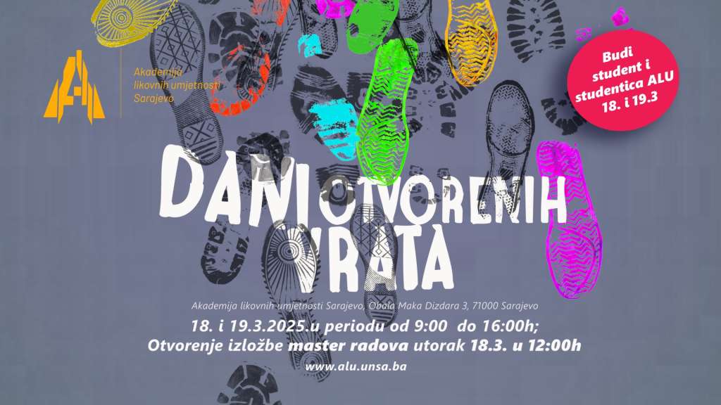 SARAJEVO, 14. marta (FENA) - U okviru planiranih aktivnosti kampanje za promociju upisa na Univerzitetu u Sarajevu u studijskoj 2025/2026. godini, Akademija likovnih umjetnosti Univerziteta u Sarajevu organizira Dane otvorenih vrata, koji će biti održani 18. i 19. marta, u periodu od 09.00 do 16.00 sati.