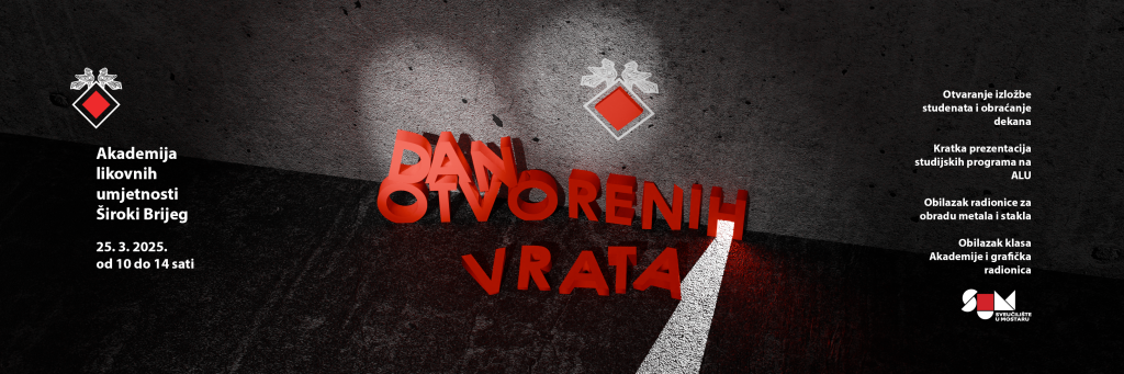 ŠIROKI BRIJEG, 18.ožujka (FENA) - Akademija likovnih umjetnosti Sveučilišta u Mostaru na Širokom Brijegu održat će Dan otvorenih vrata u utorak, 25. ožujka, s programom koji počinje u 10 sati u Sveučilišnoj galeriji Akademije.
