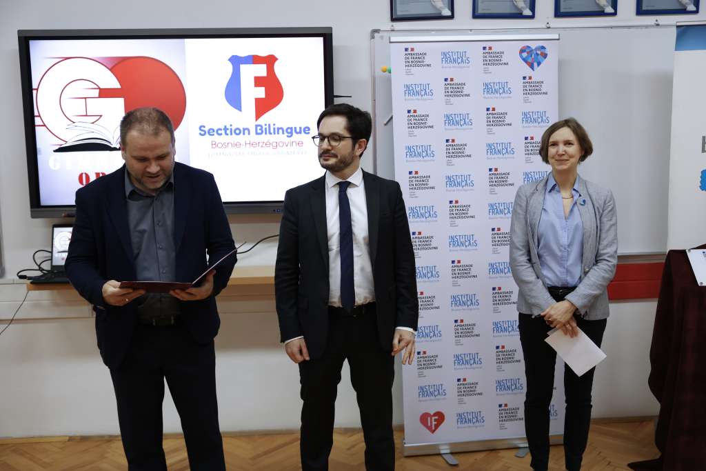 SARAJEVO, 20. marta (FENA) - Ambasador Francuske u Bosni i Hercegovini François Delmas sa saradnicima posjetio je danas JU Gimnazija Obala Sarajevo kako bi obnovili oznaku kvalitete LabelFrancEducation koju je ta obrazovna ustanova dobila 2021. godine. LabelFrancEducation je dokaz kvalitete koji od 2012. godine dodjeljuje Ministarstvo Evrope i vanjskih poslova Francuske izvrsnim frankofonim dvojezičnim odjeljenjima u cijelom svijetu.