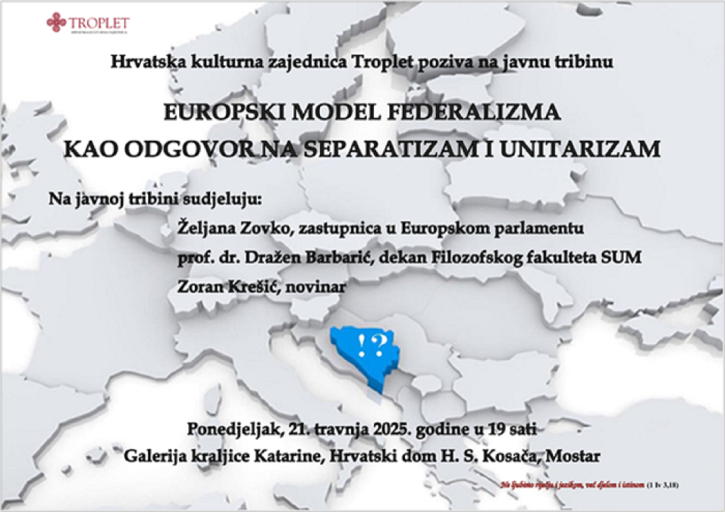 MOSTAR, 18. travnja (FENA) - Hrvatska kulturna zajednica "Troplet" organizira javnu tribinu "Europski model federalizma kao odgovor na separatizam i unitarizam" koja će biti održana u ponedjeljak, 21. travnja, u 19 sati u u Galeriji kraljice Katarine Kosača u Mostaru.
