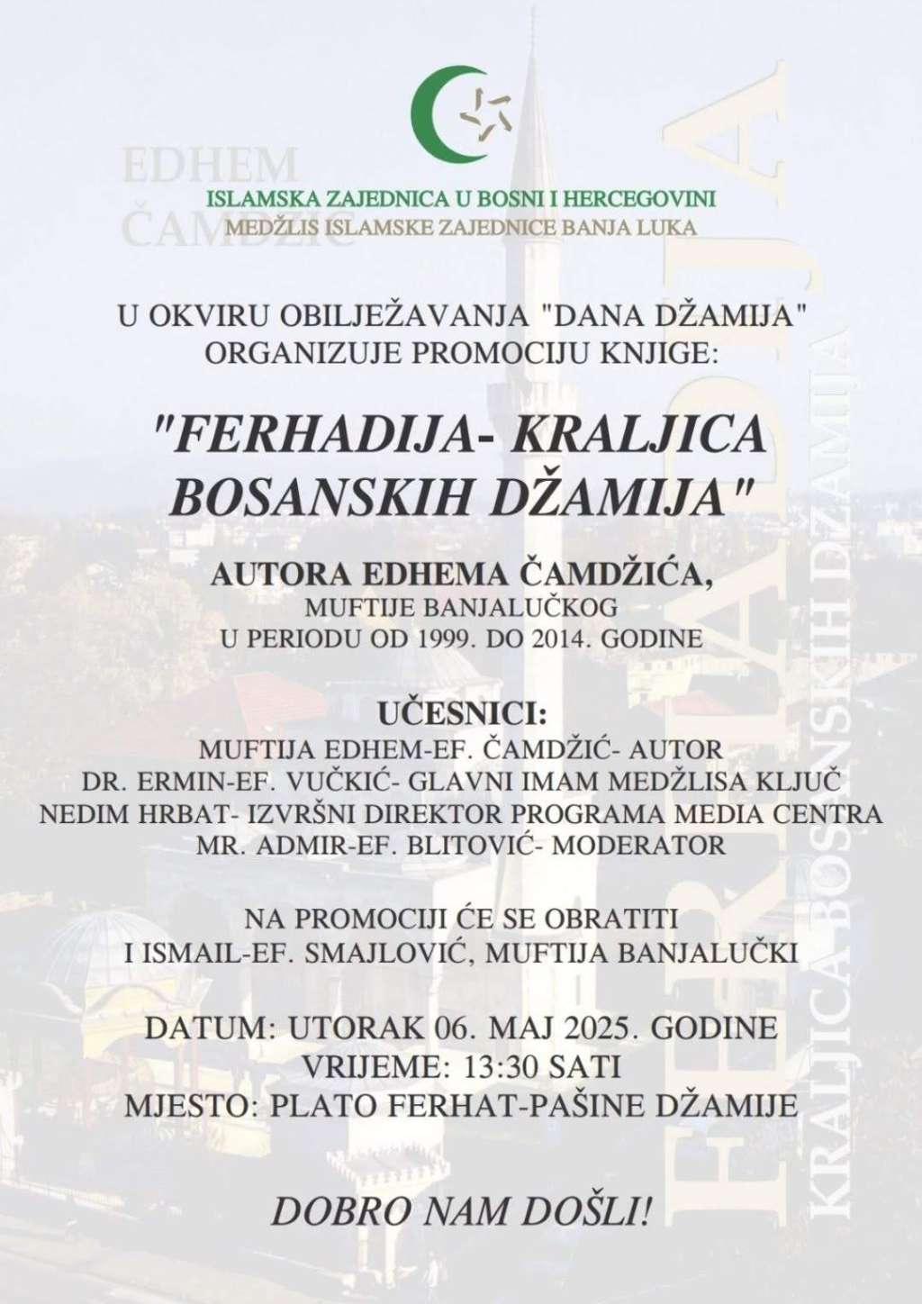BANJA LUKA, 5. maja (FENA) – Knjiga "Ferhadija – kraljica bosanskih džamija", autora Edhema ef. Čamdžića, bivšeg muftije banjalučkog u periodu od 1999. do 2014. godine, bit će predstavljena 6. maja u okviru obilježavanja Dana džamija.