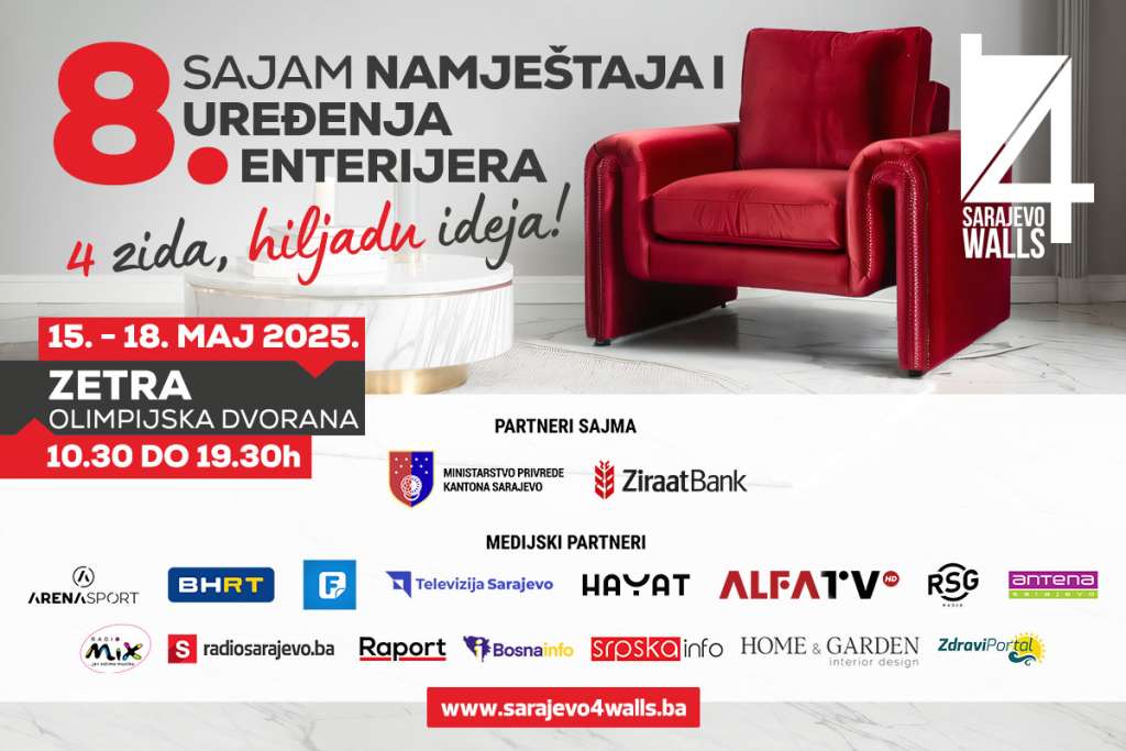 SARAJEVO, 8. maja (FENA) - Glavni grad Bosne i Hercegovine i ove godine postaje regionalni centar dizajna, kreativnosti i industrijske inovacije – jer osmo izdanje Međunarodnog sajma namještaja Sarajevo 4 Walls otvara svoja vrata od 15. do 18. maja 2025. godine u dvorani Zetra, saopćili su organizatori najavljujući ovu sajamsku manifestaciju.