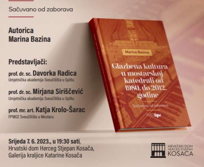 ZAGREB, 11. svibnja (FENA) - U organizaciji Odjela za glazbu Matice hrvatske Zagreb i Udruge "Klub Mostaraca" iz Zagreba u subotu je u Matici hrvatskoj, u Dvorani Jure Petričevića, zagrebačkoj javnosti predstavljenja knjiga "Glazbena kultura u mostarskoj katedrali od 1980. do 2012. godine - sačuvano od zaborava", autorice doc. dr. sc. Marine Bazina.