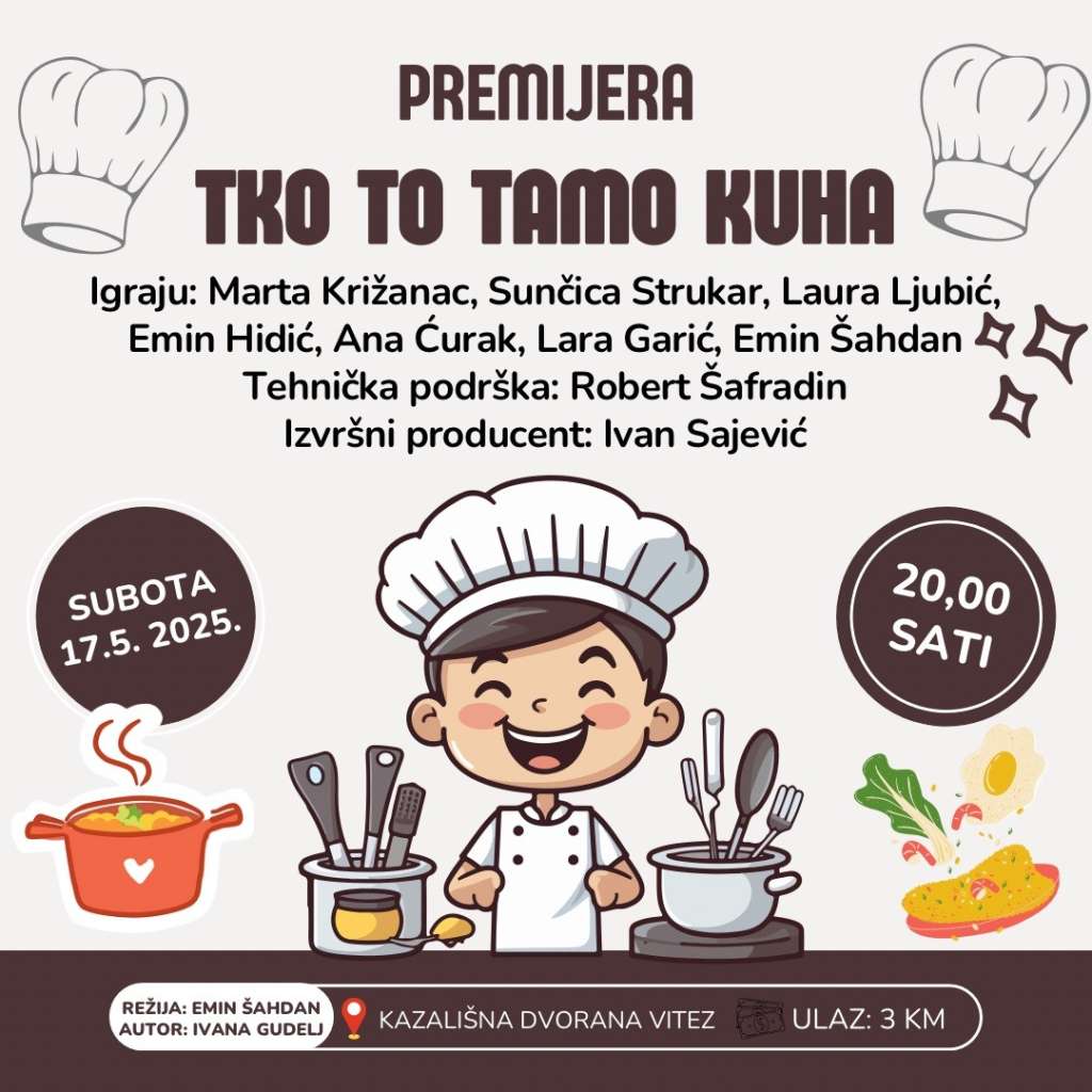 VITEZ, 16. svibnja (FENA) - U okviru ovogodišnje manifestacije 10. dani hrvatskog kazališta u Bosni i Hercegovini, publika će imati priliku pogledati premijeru predstave „Tko to tamo kuha?“ u izvebi Gradsko kazalište mladih Vitez. Premijera će biti izvedena u subotu, 17. svibnja, u Kazališnoj dvorani u Vitezu, s početkom u 20 sati.