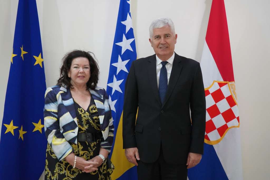 MOSTAR, 30. svibnja (FENA) - Predsjednik HDZ-a BiH Dragan Čović u Mostaru je održao je u petak radni sastanak s posebnom izaslanicom Ujedinjenog Kraljevstva Velike Britanije i Sjeverne Irske za zapadni Balkan Karen Pierce. Glavne teme današnjeg sastanka obuhvatile su analizu aktualnog političkog trenutka u BiH i regiji, europski i euroatlantski put BiH te očekivanja od predstojećeg vremena.