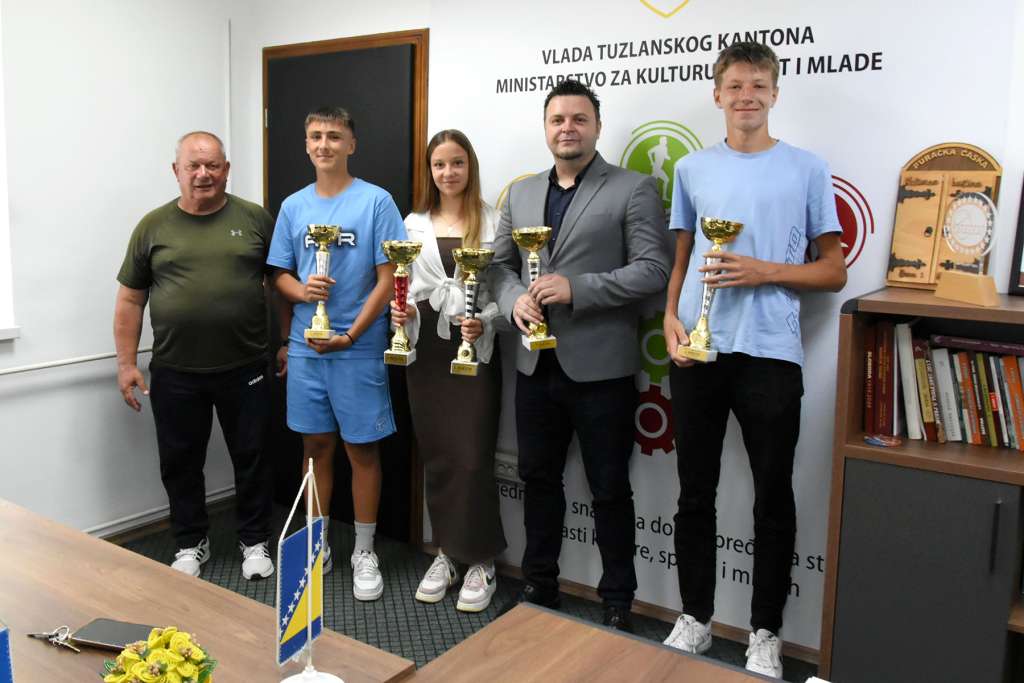 TUZLA, 4. juna (FENA) - Ministar za kulturu sport i mlade Tuzlanskog kantona Damir Gazdić upriličio je prijem za članove Teniskog kluba "Sloboda“ Tuzla koji su osvajači medalja na nedavno održanom državnom prvenstvu. U pratnji trenera Mirze Mulahasanovića prijemu su prisustvovali Zana Kunosić, Nikola Pavljašević i Benjamin Demirović.